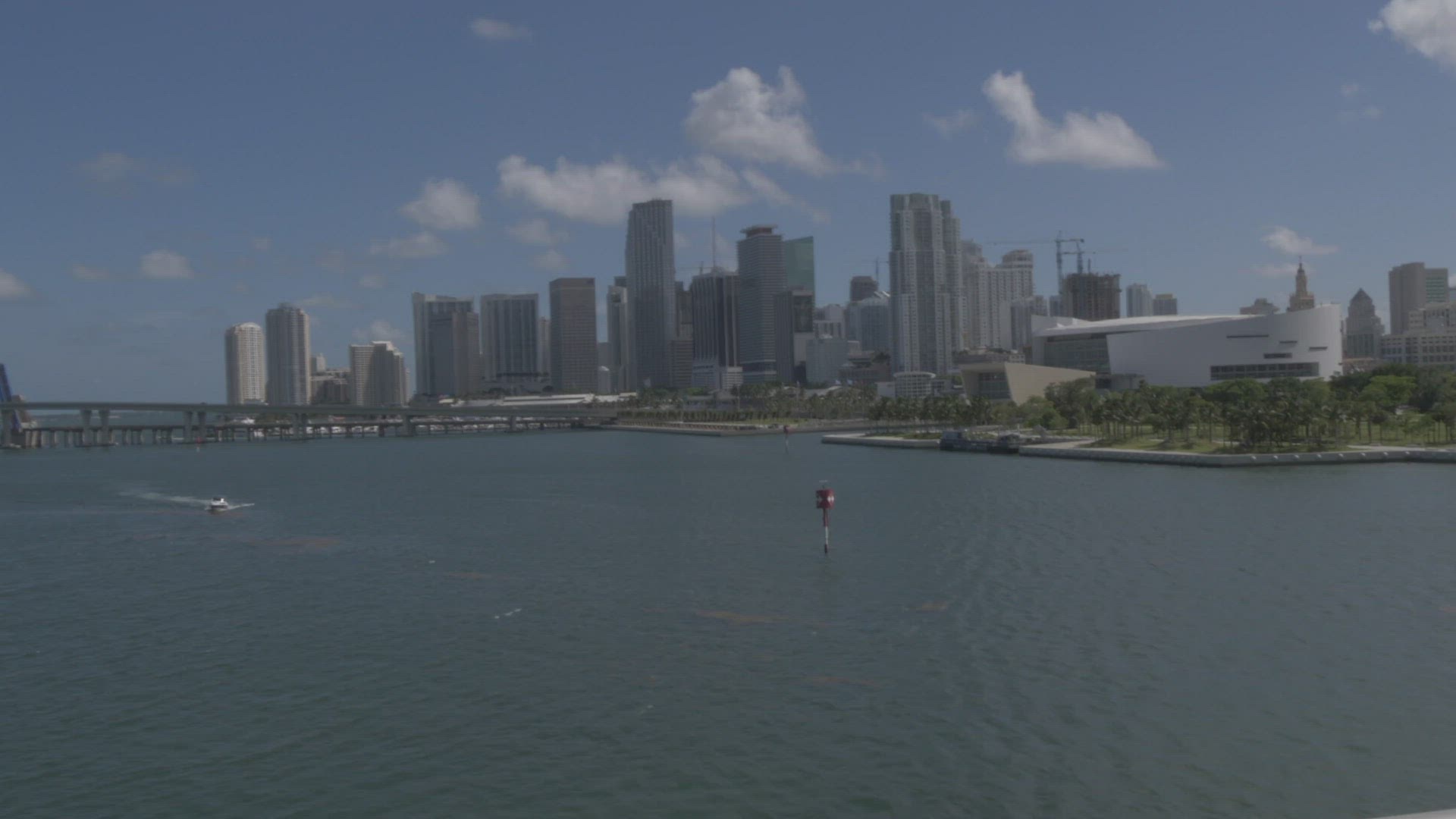 > Aerial view of causeway and Miami, Florida