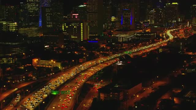 > Aerial night view of freeways leading to downtown Miami, Florida