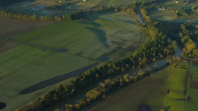 > Aerial view of Willamette River and farm land near Dayton, Oregon