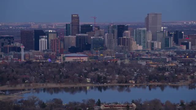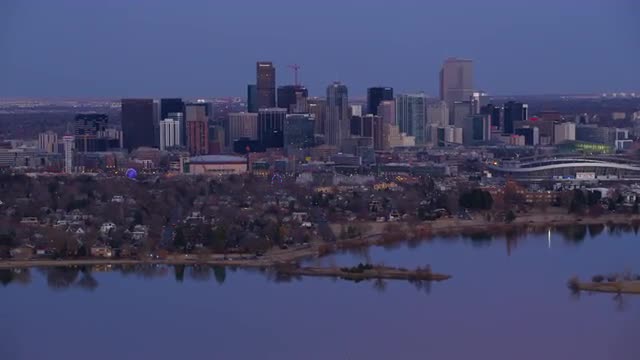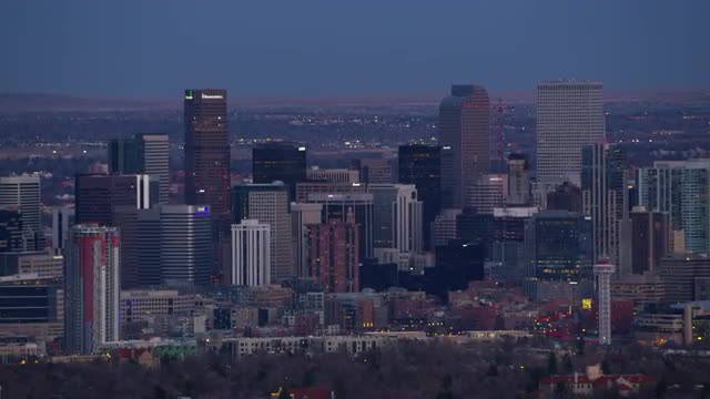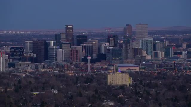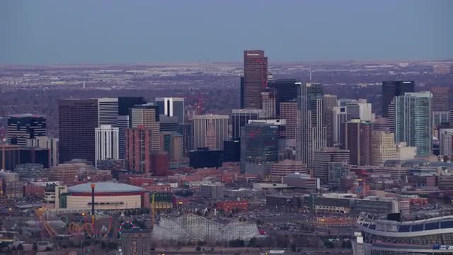> Denver, Colorado circa-2017, Aerial view of downtown Denver buildings at dusk