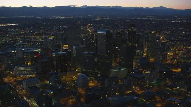 Denver, Colorado circa-2017, Aerial view of Denver at night with Rocky Mountains in background