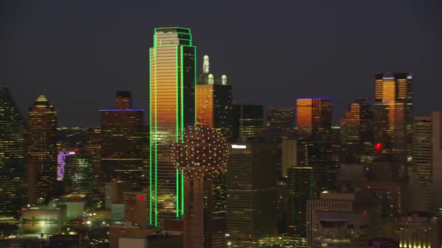 > Dallas, Texas circa-2017, Aerial view of Reunion Tower ball and Dallas Texas at night