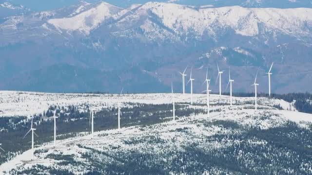 Aerial view of wind turbines in northern California mountains