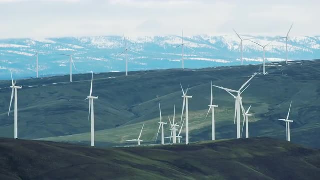 > Aerial view of wind turbines in northern California mountains