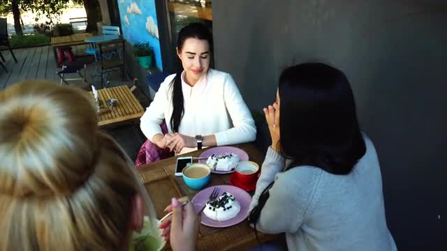 638659 - Three Beautiful Female Smile in Cafe, Talk, Tell Secrets, Eat, Drink Coffee.