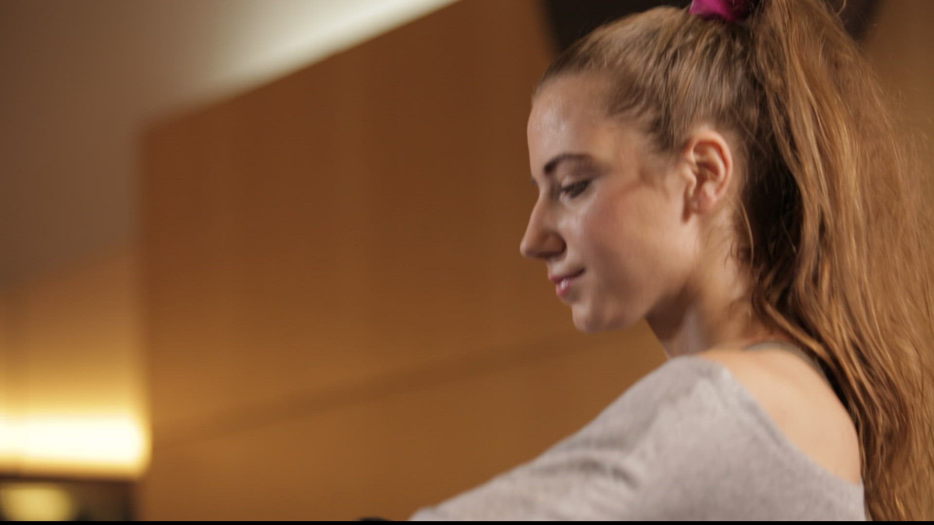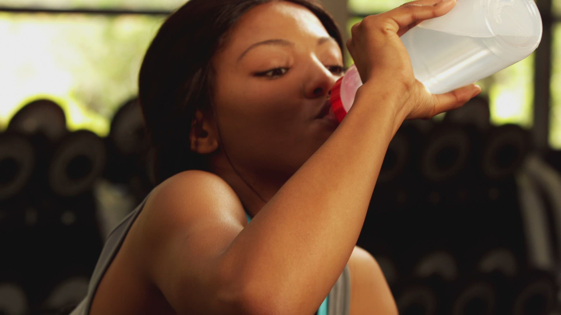 > Woman at gym takes a break