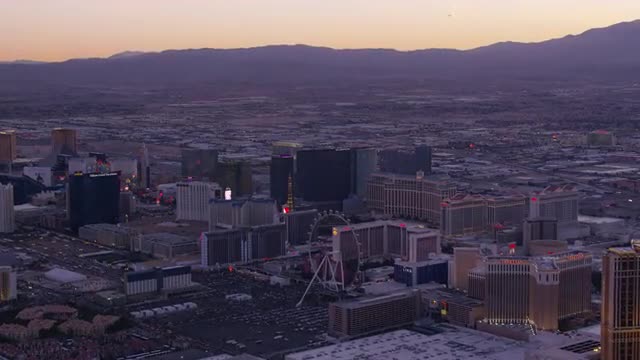 > Las Vegas, Nevada circa-2017, Aerial view of Las Vegas Strip at night. Shot with Cineflex and RED E