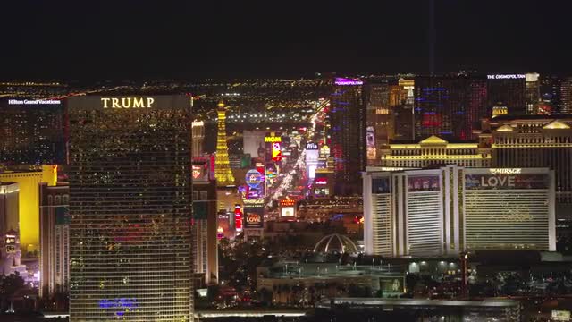 > Las Vegas, Nevada circa-2017, Aerial view of Las Vegas Strip at night. Shot with Cineflex and RED E