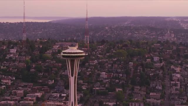 > Seattle, Washington circa-2017, Close-up aerial view of Seattle Space Needle at dawn. Shot with Cin