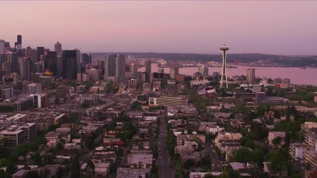 Seattle, Washington circa-2017, Aerial view of Seattle at dawn. Shot with Cineflex and RED Epic-W Helium.