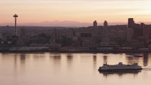 Seattle, Washington circa-2017, Aerial view of Seattle and ferry at sunrise. Shot with Cineflex and RED Epic-W Helium.