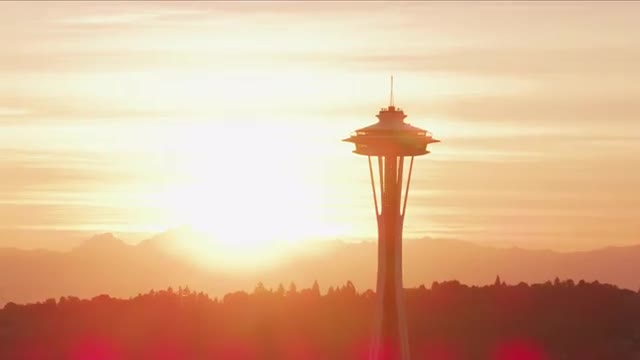 > Seattle, Washington circa-2017, Aerial view of Seattle Space Needle at sunrise. Shot with Cineflex