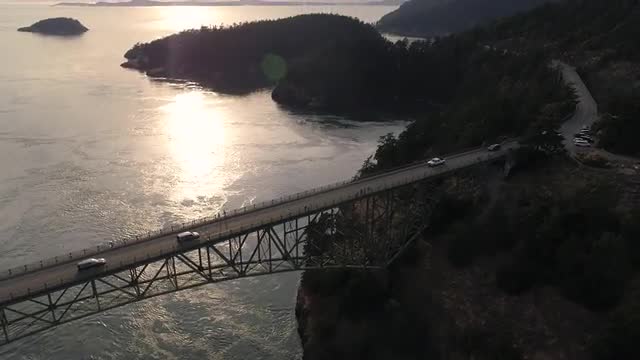 > Seattle, Washington circa-2017, Aerial view Space Needle and Puget Sound. Shot with Cineflex and RE