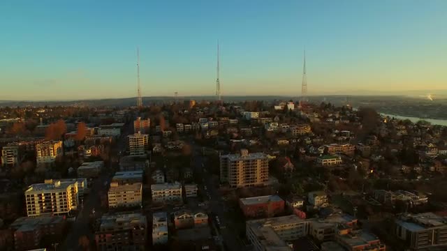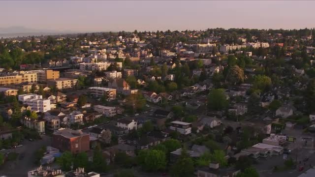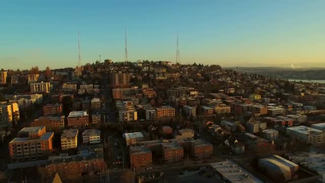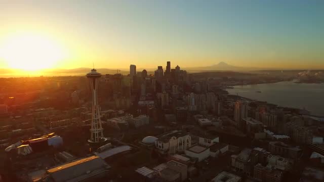 Seattle, Washington circa-2017, Reveal Space Needle and downtown from Queen Anne. Shot with Cineflex and RED Epic-W Helium.