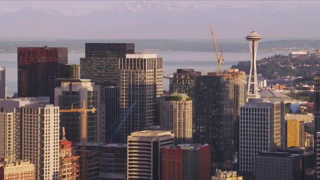 > Seattle, Washington circa-2017, Aerial view of downtown Seattle in morning. Shot with Cineflex and
