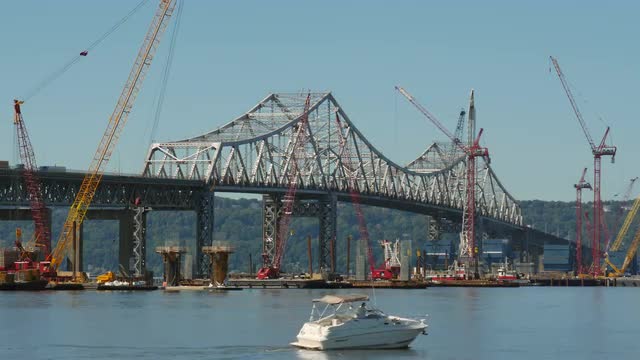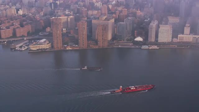 New York City circa-2017, Aerial view of barges on the Hudson River. Shot with Cineflex and RED Epic-W Helium.
