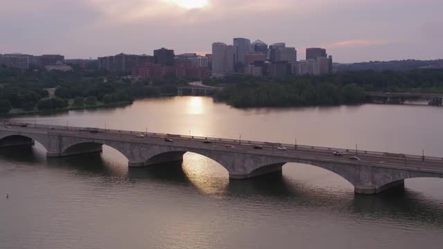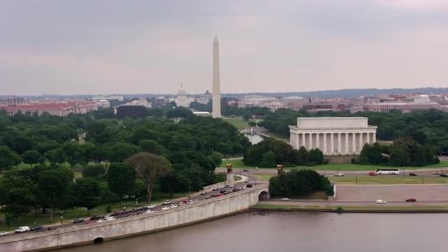 Washington, D.C. circa-2017, Aerial view of the Washington Monument, Jefferson Memorial and Potomac River. Shot with Cineflex and RED Epic-W Helium.