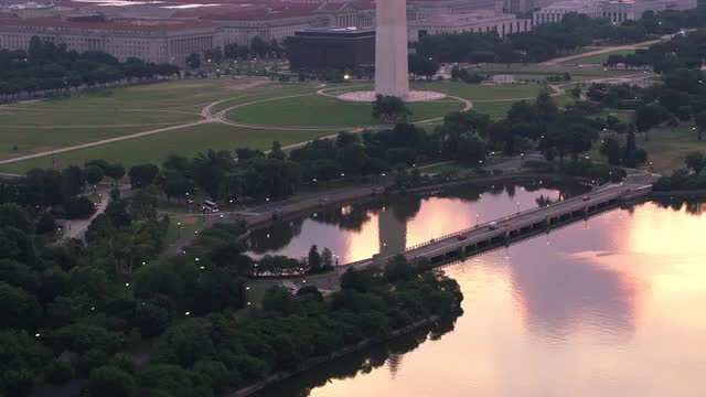 Washington, D.C. circa-2017, Aerial view of the Washington Monument reflecting in Tidal Basin at sunrise. Shot with Cineflex and RED Epic-W Helium.