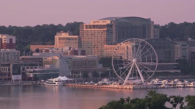 Washington, D.C. circa-2017, Aerial view of National Harbor and Capital Wheel. Shot with Cineflex and RED Epic-W Helium.