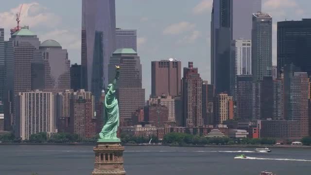 New York City, New York circa-2017, Aerial view of Statue of Liberty and Manhattan. Shot with Cineflex and RED Epic-W Helium.