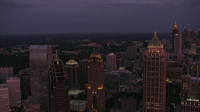 Atlanta, Georgia circa-2017, Aerial shot of downtown Atlanta at sunset. Shot with Cineflex and RED Epic-W Helium.